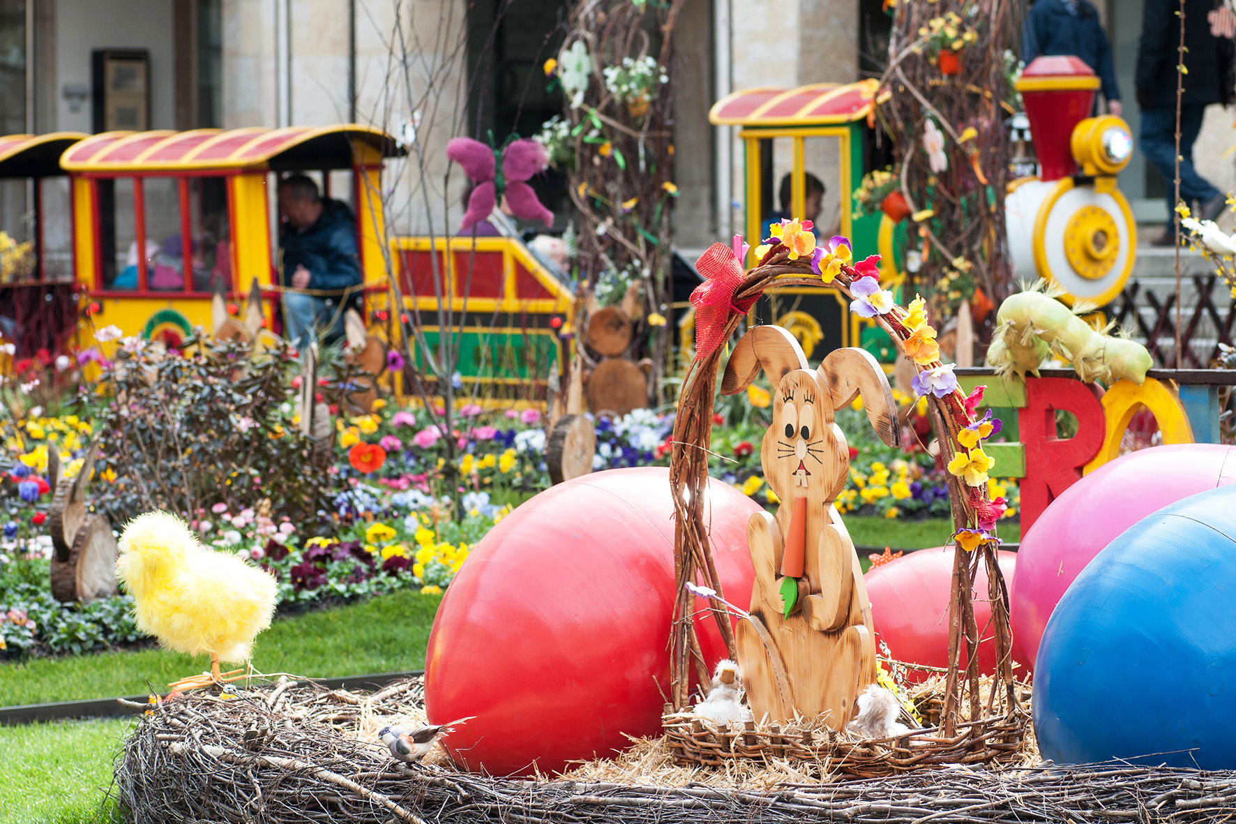 Ein Karussell und eine frühlingshafte Mini-Eisenbahn vor dem Rathaus sorgen für Unterhaltung auch bei den kleinsten Besucher:innen.