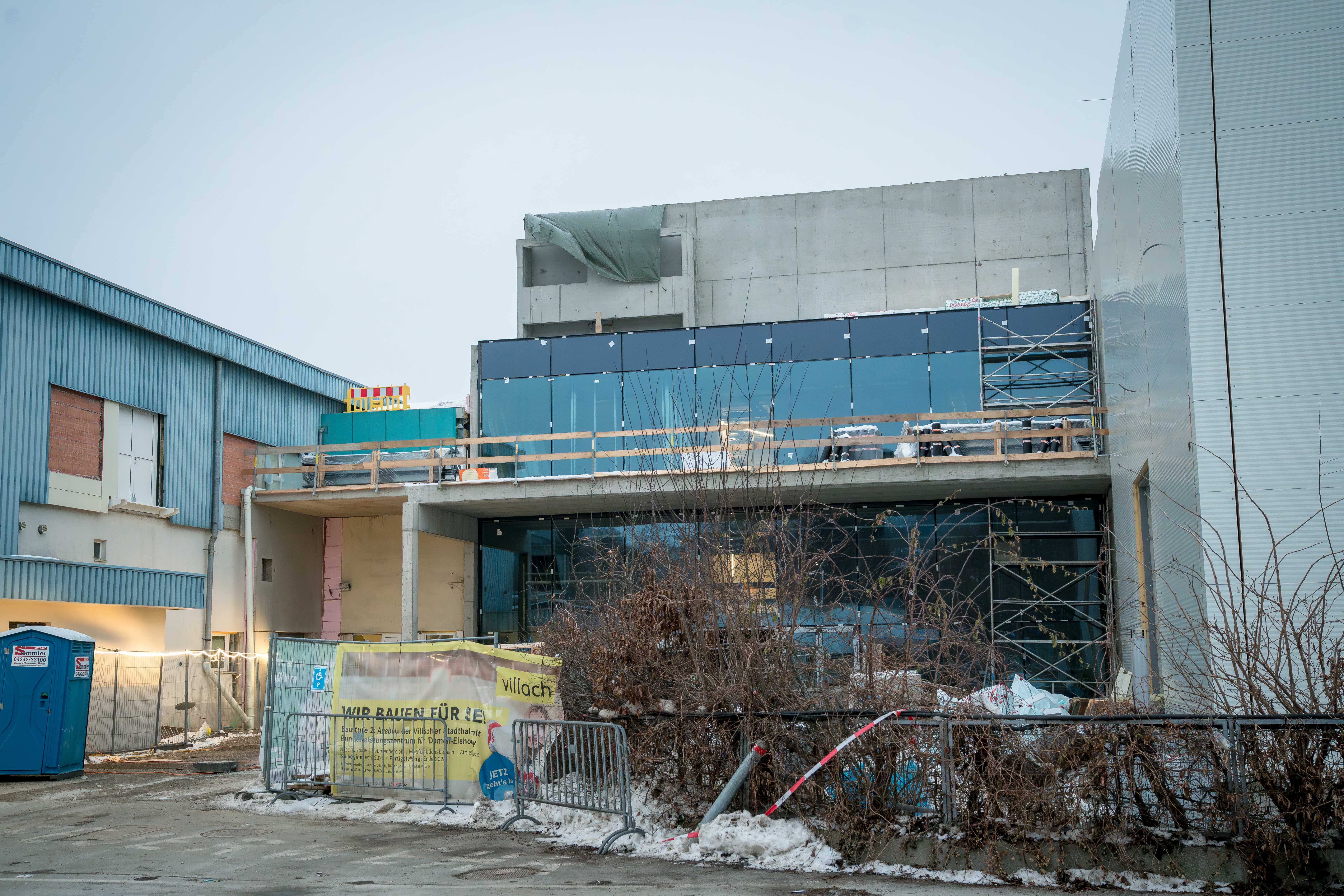 Der Rohbau steht, das Dach ist drauf: Mit einer Gleichenfeier wurde heute, Mittwoch, der Zwischenstand beim Neubau der zweiten Eishalle in Villach gewürdigt. Vertreter:innen der Baufirmen und der Politik feierten den wichtigen Schritt auf dem Weg zur Fertigstellung. Die ist für Oktober des heurigen Jahres geplant. Im November soll es die offizielle Eröffnung geben. „Wir sind im Zeitplan“, sagt Villachs