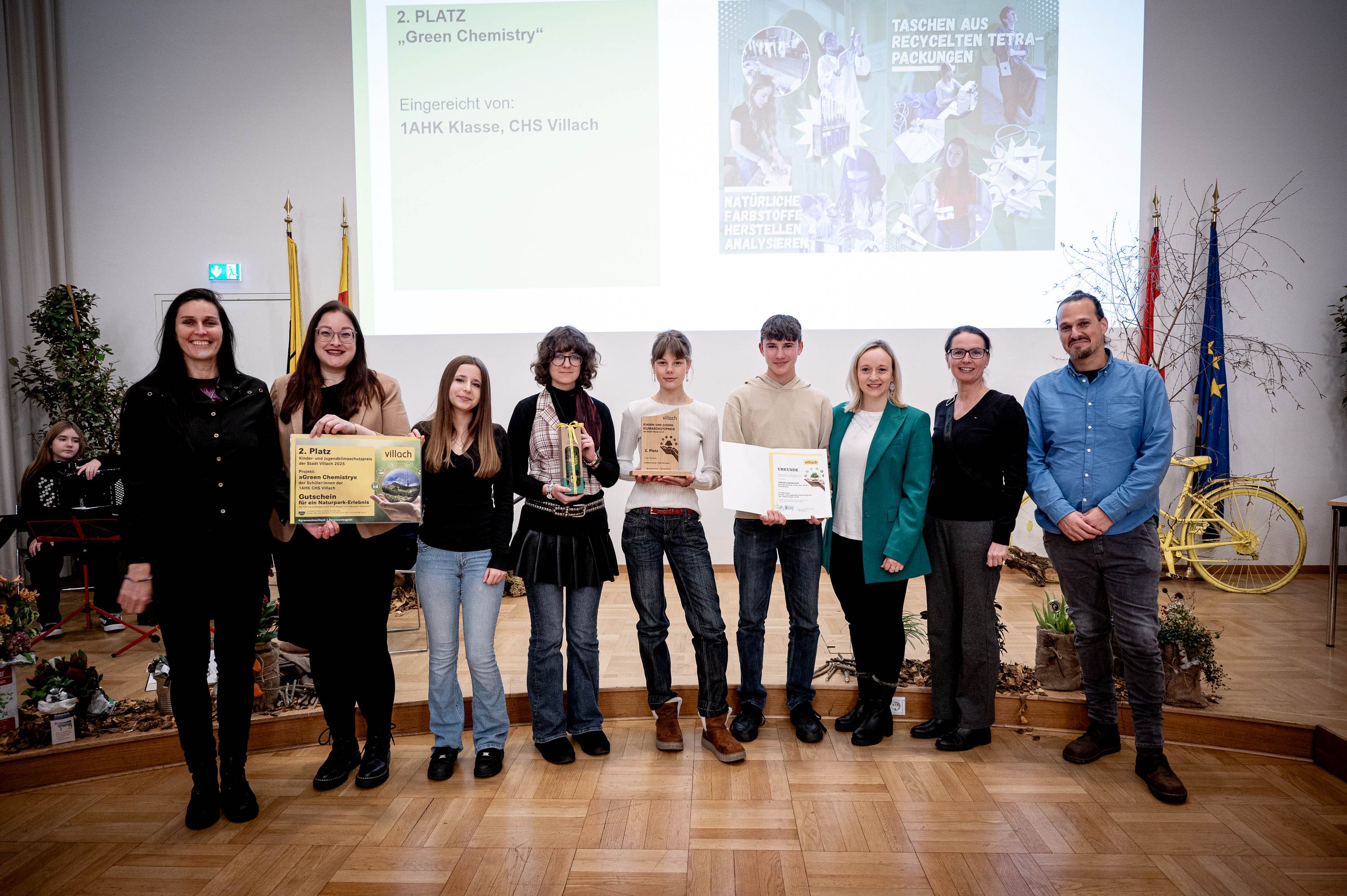 In der Kategorie der Kinder und Jugendlichen räumte die 2a-Klasse der Volkschule Landskron mit ihrem Buch „Wir reden über Müll“ den Hauptpreis ab. Auf dem zweiten Platz reihte die Jury das CHS-Projekt „Green Chemistry“ mit Fasern und Farbstoffen aus nicht mehr benötigten Lebensmitteln und Taschen aus Tetrapacks.